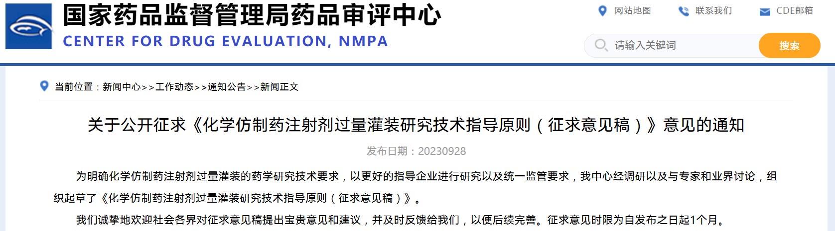 關(guān)于公開征求《化學仿制藥注射劑過量灌裝研究技術(shù)指導原則(征求意見稿)》意見的通知