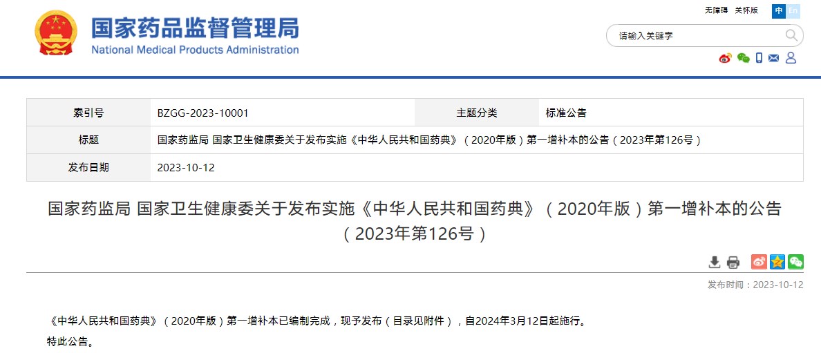 國家藥監(jiān)局 國家衛(wèi)生健康委關(guān)于發(fā)布實施《中華人民共和國藥典》(2020年版)第一增補本的公告(2023年第126號)