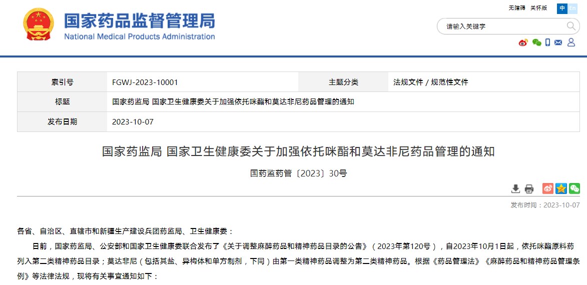 國家藥監(jiān)局 國家衛(wèi)生健康委關(guān)于加強依托咪酯和莫達非尼藥品管理的通知