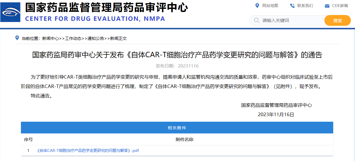 國家藥監(jiān)局藥審中心關(guān)于發(fā)布《自體CAR-T細(xì)胞治療產(chǎn)品藥學(xué)變更研究的問題與解答》的通告