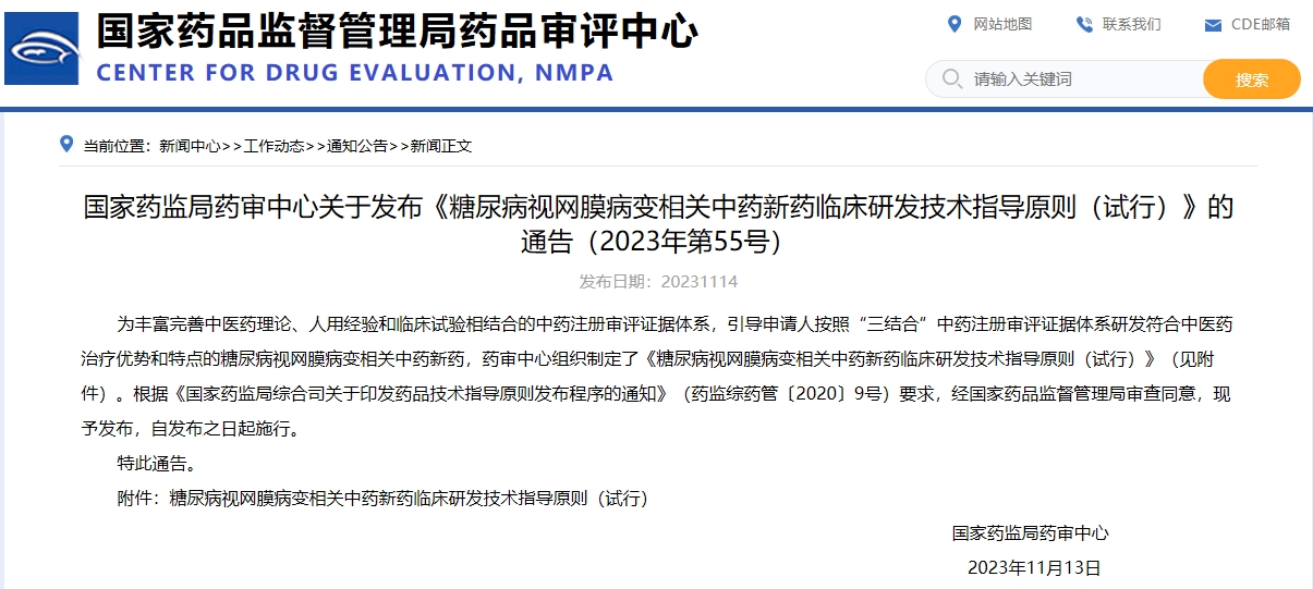 國家藥監(jiān)局藥審中心關(guān)于發(fā)布《糖尿病視網(wǎng)膜病變相關(guān)中藥新藥臨床研發(fā)技術(shù)指導(dǎo)原則(試行)》的通告(2023年第55號)