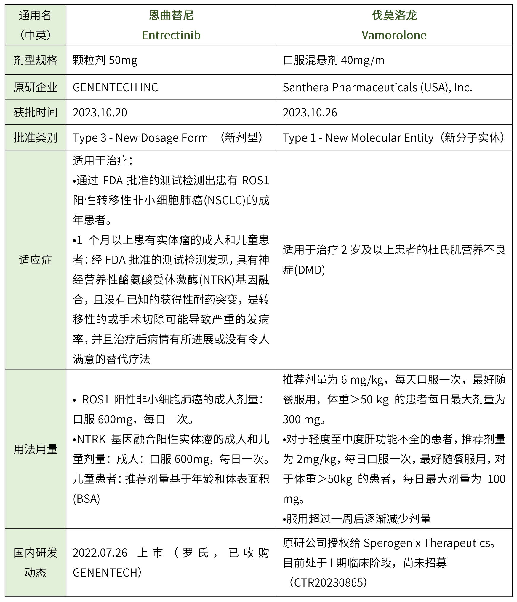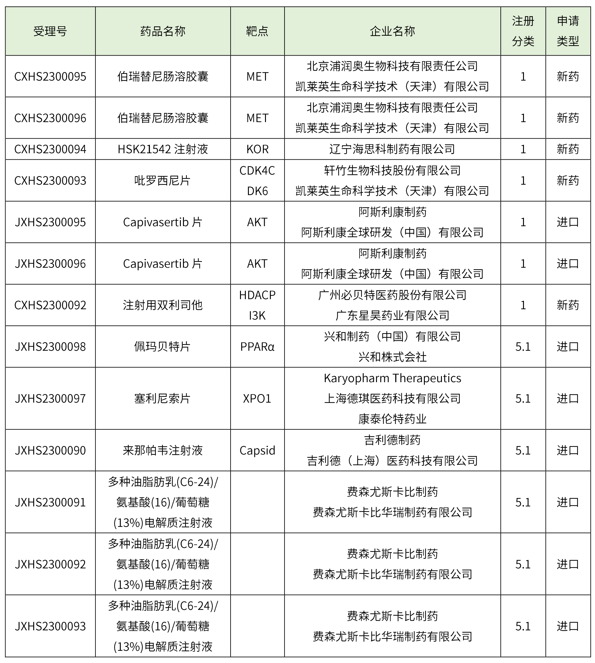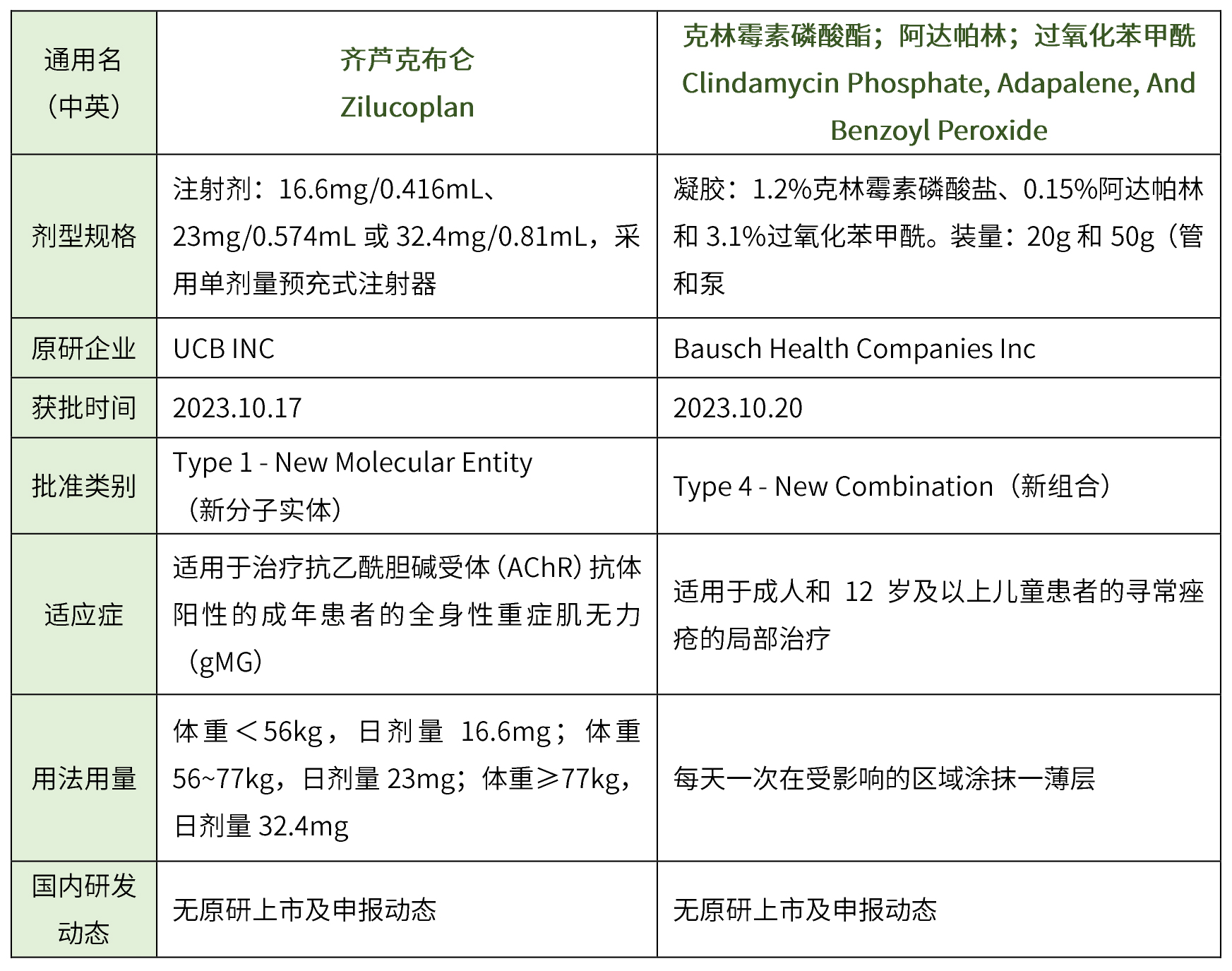 化學(xué)藥品1類3個(甲磺酸貝福替尼膠囊、利特昔替尼膠囊、氘可來昔替尼片),5.1類2個(烏帕替尼緩釋片、利匹韋林注射液),藥物詳細(xì)信息見下表。