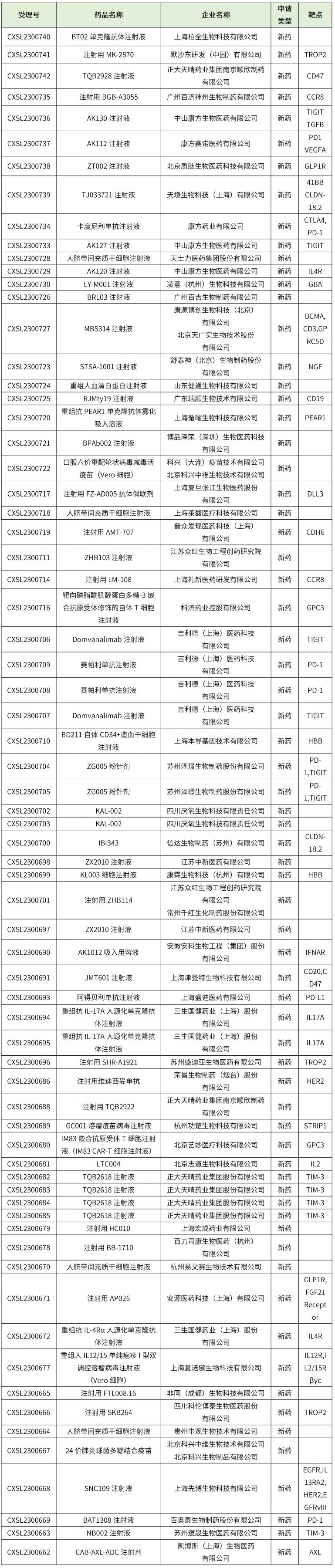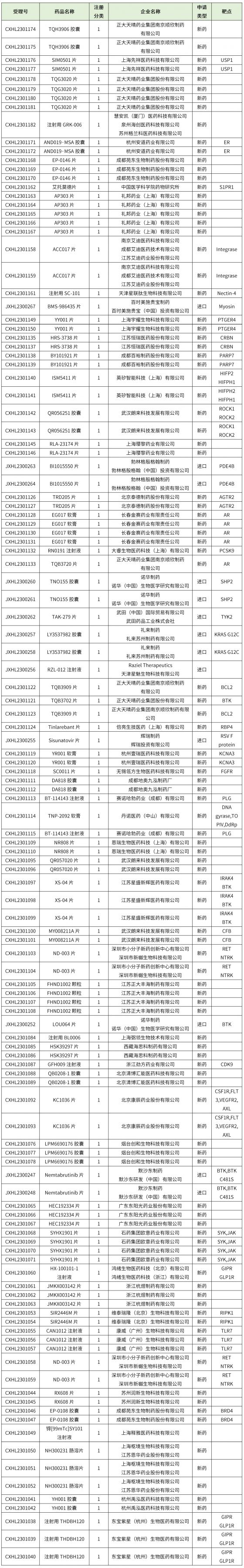 ① 化藥1類新藥61個(艾托莫德片、TQH3906膠囊、SIM0501片、TQG3020片、BMS-986435片、BI1015550片、TNO155膠囊、TAK-279片、LY3537982膠囊、Sisunatovir片、LOU064片、Nemtabrutinib片等),藥物詳細(xì)信息見下表。