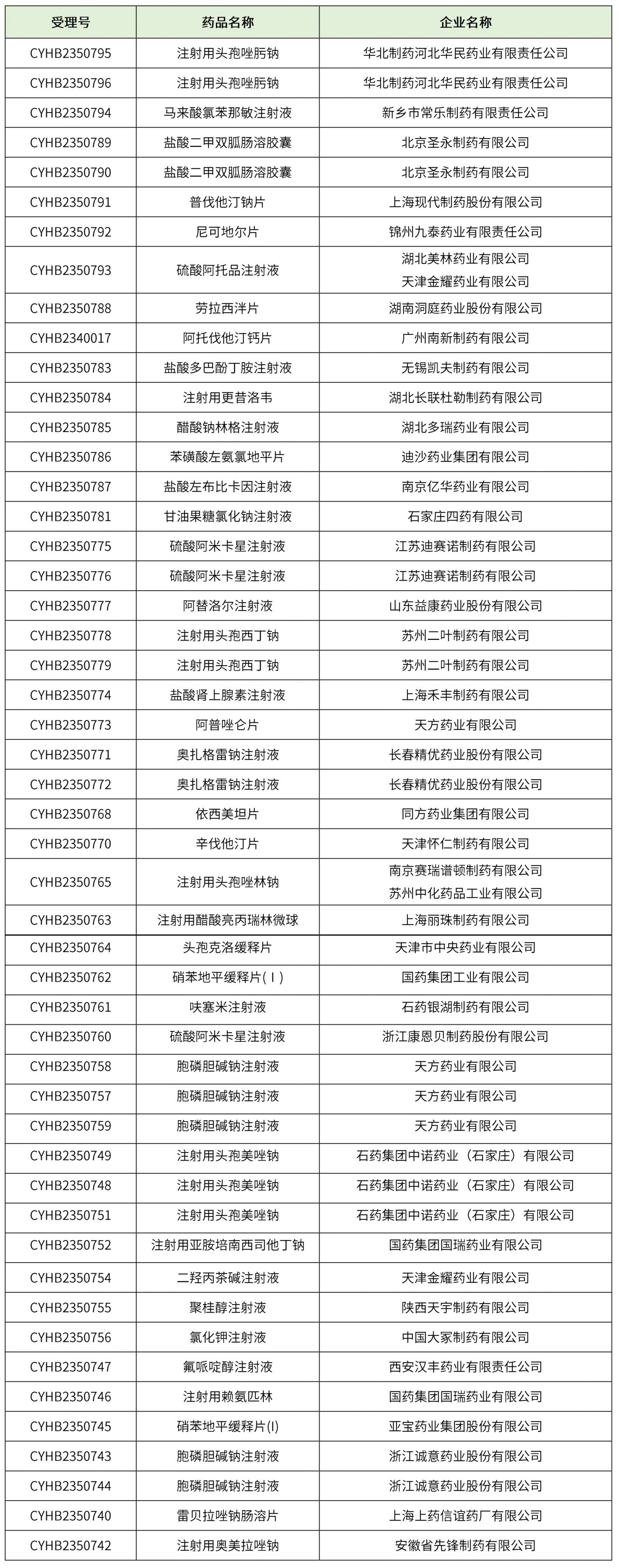 化藥一致性評價38個(注射用頭孢唑肟鈉、鹽酸二甲雙胍腸溶膠囊、鹽酸左布比卡因注射液、硫酸阿米卡星注射液、辛伐他汀片、胞磷膽堿鈉注射液、氟哌啶醇注射液、注射用賴氨匹林、注射用奧美拉唑鈉等),藥物詳細(xì)信息見下表。