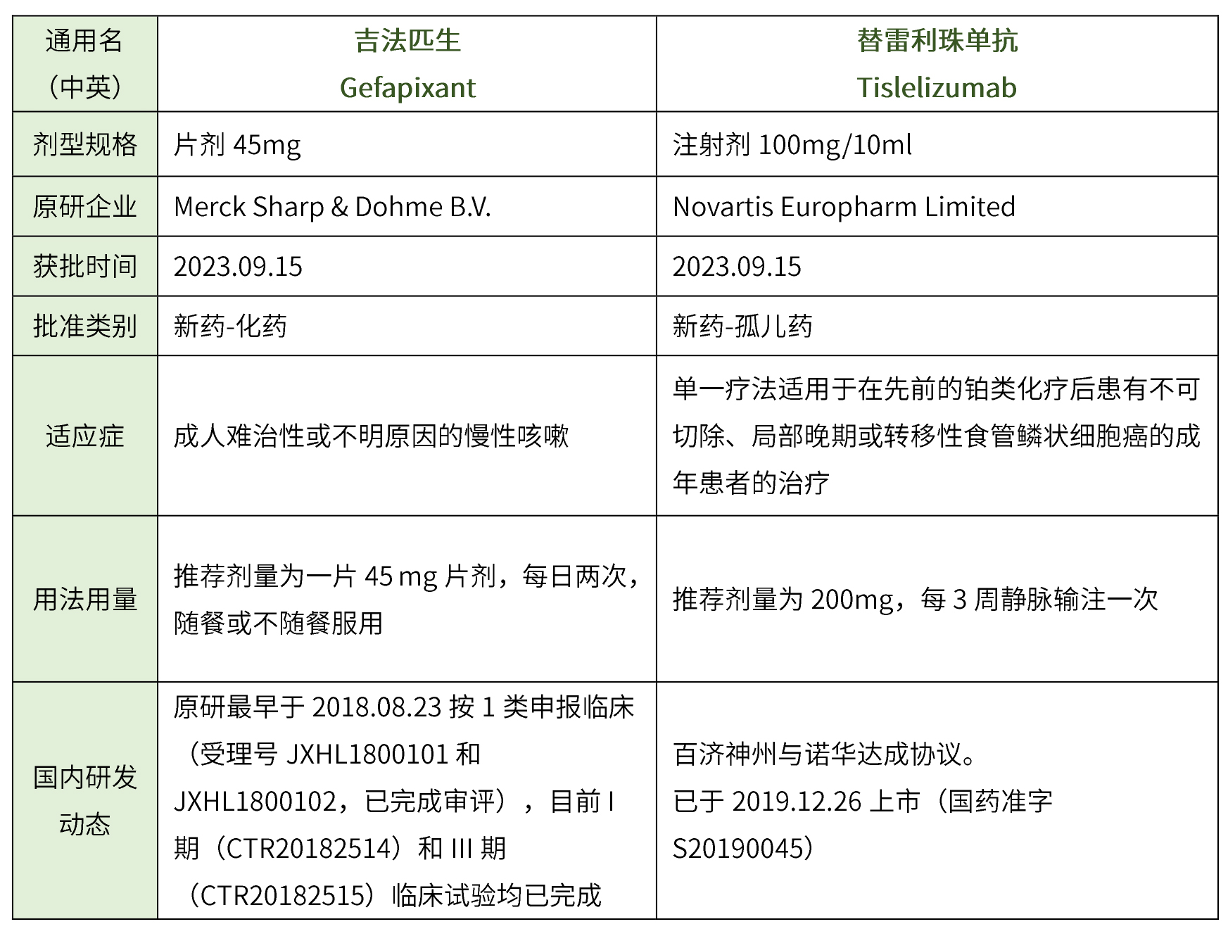 共計5個,其中化藥3個(吉法匹生片、艾拉司群片、克立他酶注射液,生物藥2個(替雷利珠單抗注射液、艾可瑞妥單抗注射用濃溶液),藥物詳細(xì)信息見下表。