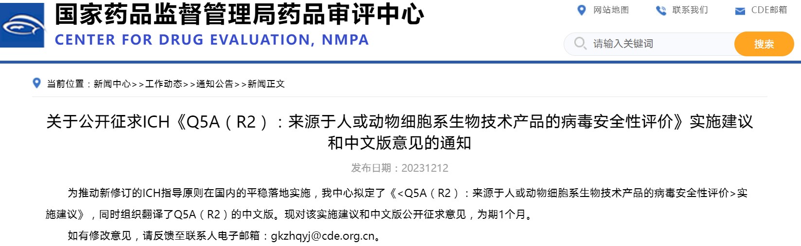 關(guān)于公開征求ICH《Q5A(R2):來源于人或動物細胞系生物技術(shù)產(chǎn)品的病毒安全性評價》實施建議和中文版意見的通知