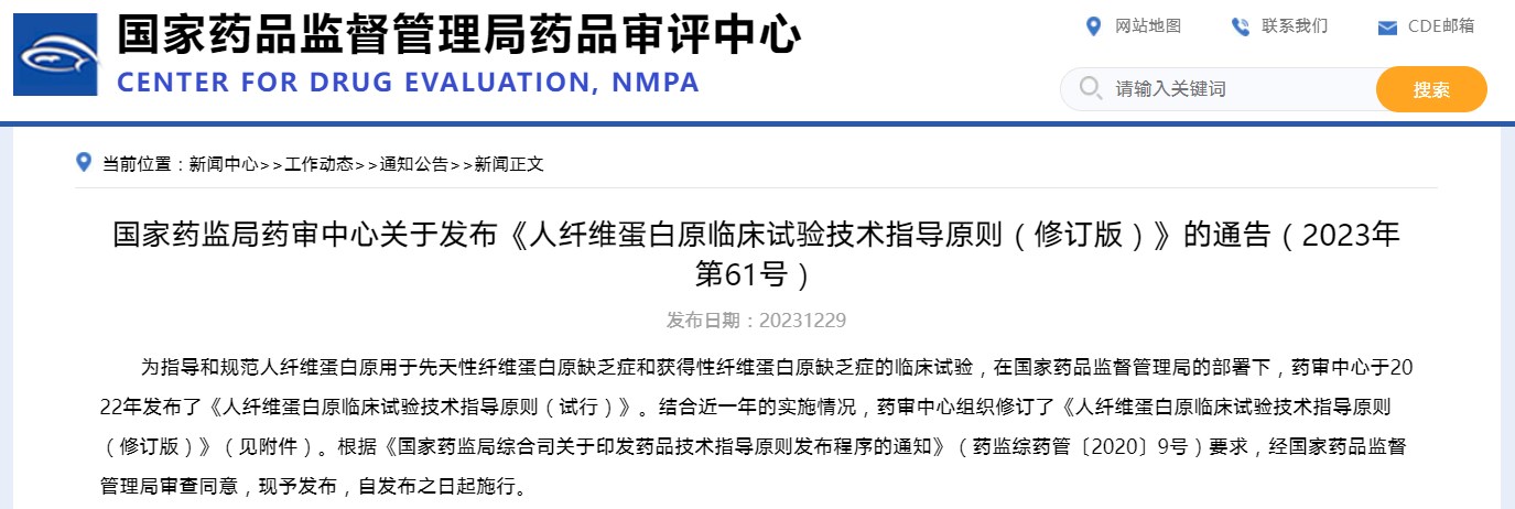 國家藥監(jiān)局藥審中心關(guān)于發(fā)布《人纖維蛋白原臨床試驗技術(shù)指導原則(修訂版)》的通告(2023年第61號)