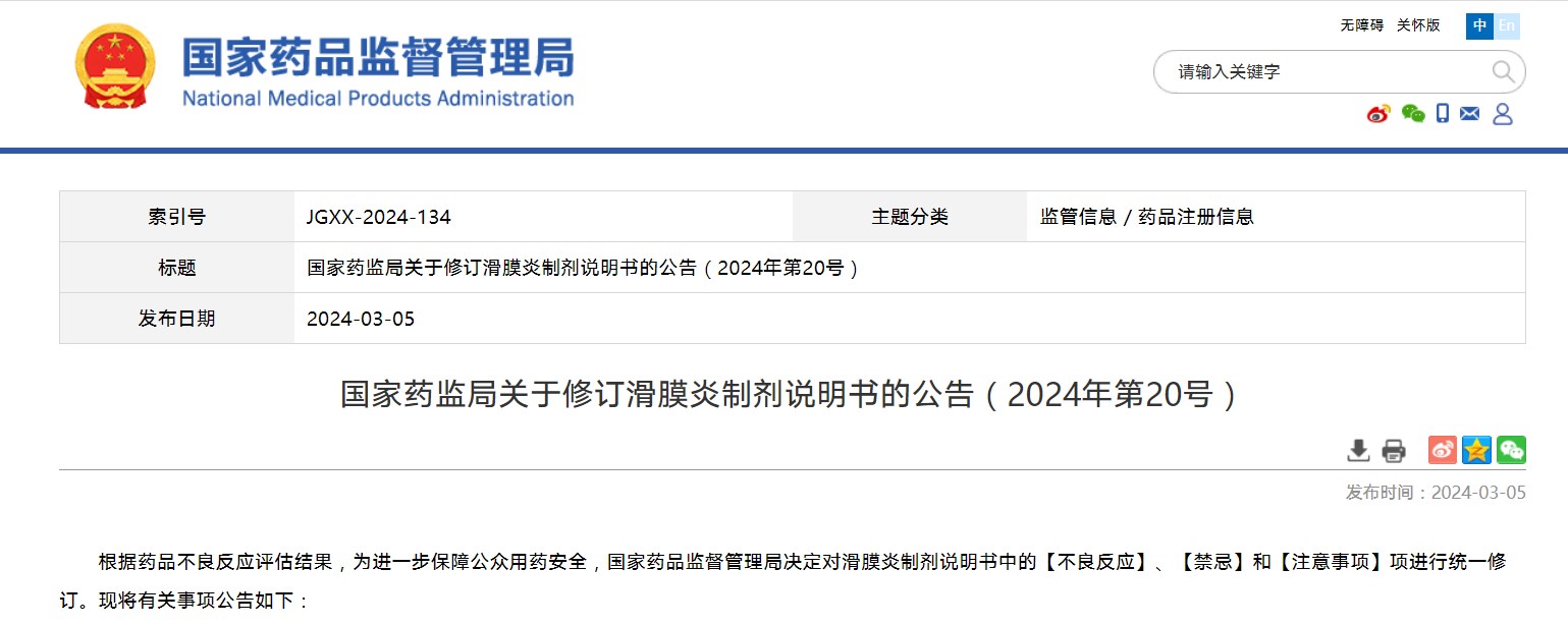 國家藥監(jiān)局關(guān)于修訂滑膜炎制劑說明書的公告(2024年第20號(hào))