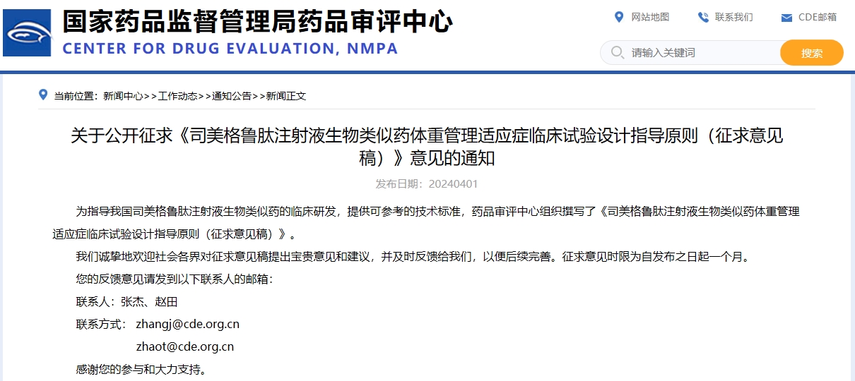 關(guān)于公開征求《司美格魯肽注射液生物類似藥體重管理適應(yīng)癥臨床試驗設(shè)計指導(dǎo)原則(征求意見稿)》意見的通知