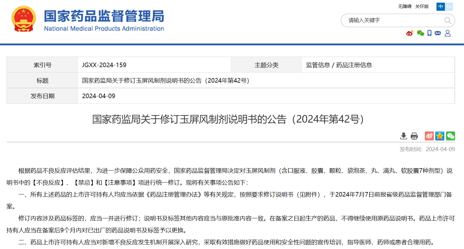 國家藥監(jiān)局關(guān)于修訂玉屏風(fēng)制劑說明書的公告(2024年第42號)