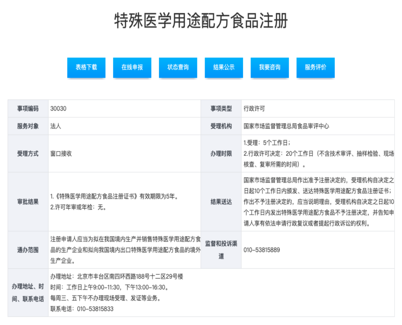 國家市場監(jiān)督管理總局SAMR食品審評機(jī)構(gòu)承擔(dān)特殊醫(yī)學(xué)用途配方食品注冊申請的受理、審評等工作??傻卿浘W(wǎng)站進(jìn)行線上注冊申報。網(wǎng)址:https://tyspzc.gsxt.gov.cn/stzcww/login/loginAction!login.dhtml
