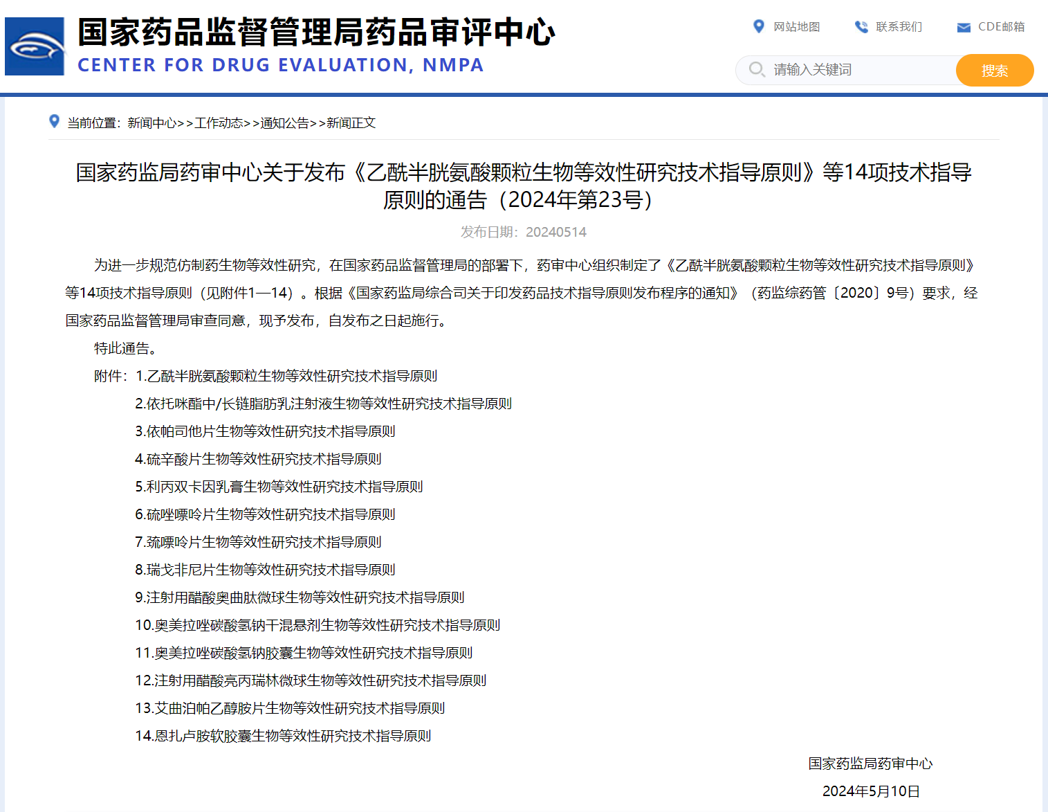國家藥監(jiān)局藥審中心關(guān)于發(fā)布《乙酰半胱氨酸顆粒生物等效性研究技術(shù)指導(dǎo)原則》等14項技術(shù)指導(dǎo)原則的通告(2024年第23號)