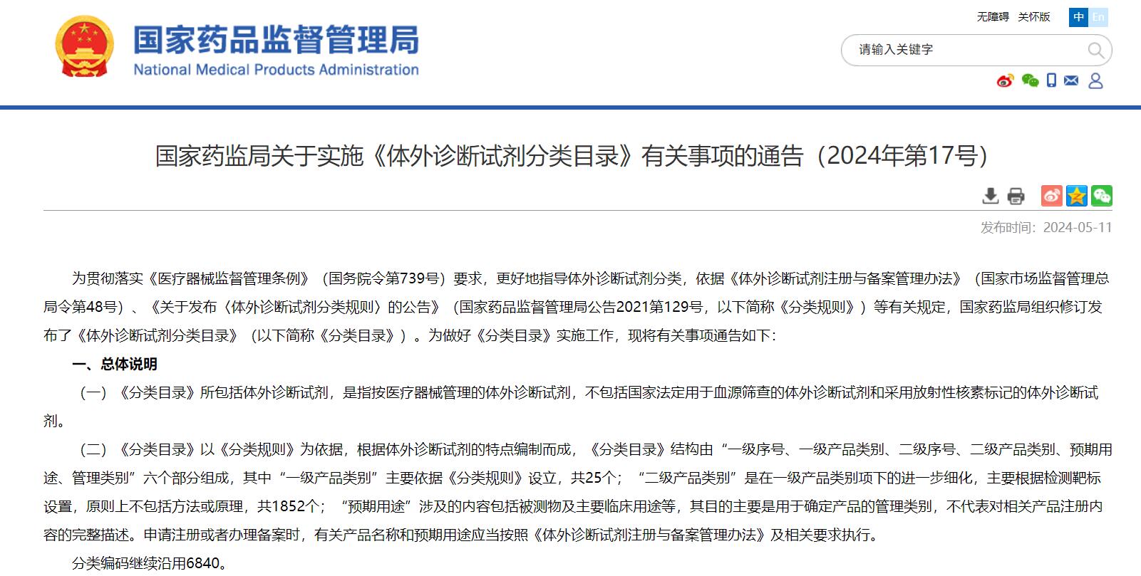 國家藥監(jiān)局關(guān)于實施《體外診斷試劑分類目錄》有關(guān)事項的通告(2024年第17號)