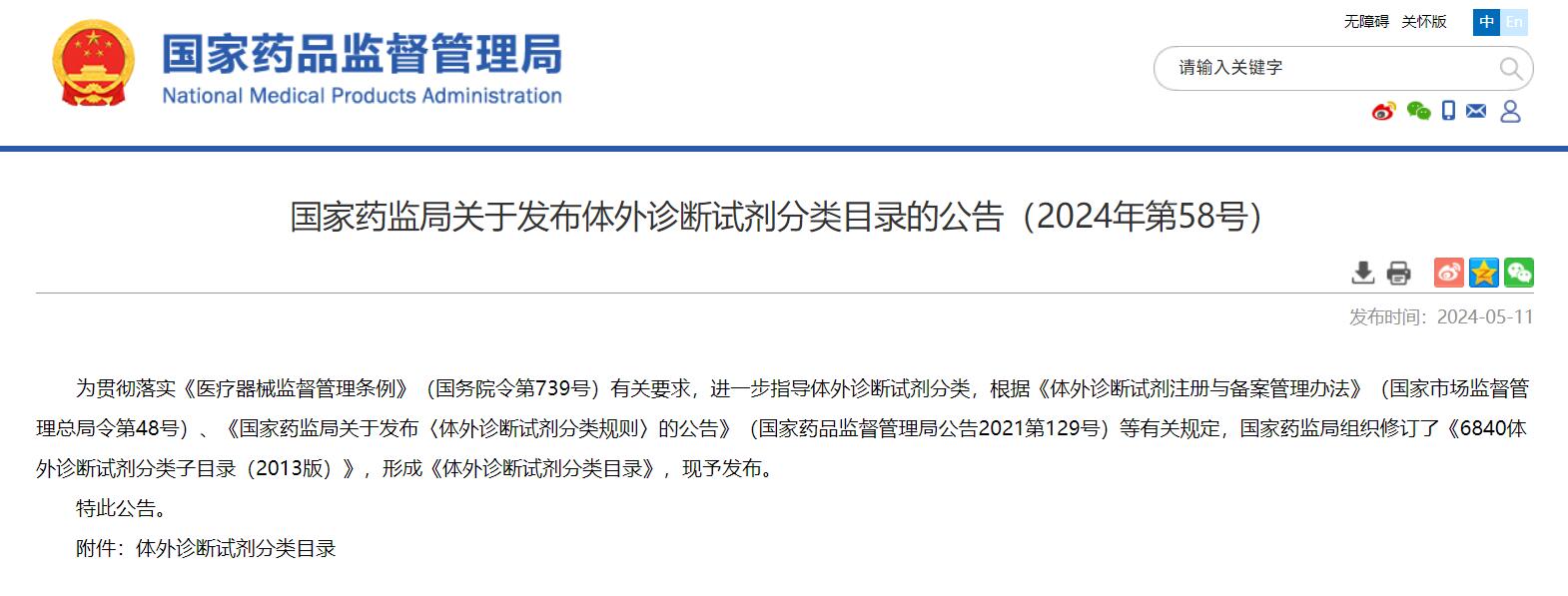 國家藥監(jiān)局關(guān)于發(fā)布體外診斷試劑分類目錄的公告(2024年第58號)
