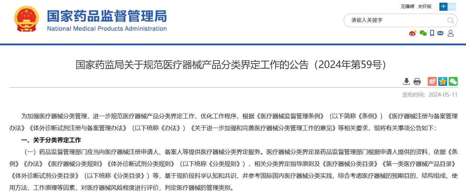 國家藥監(jiān)局關(guān)于規(guī)范醫(yī)療器械產(chǎn)品分類界定工作的公告(2024年第59號)