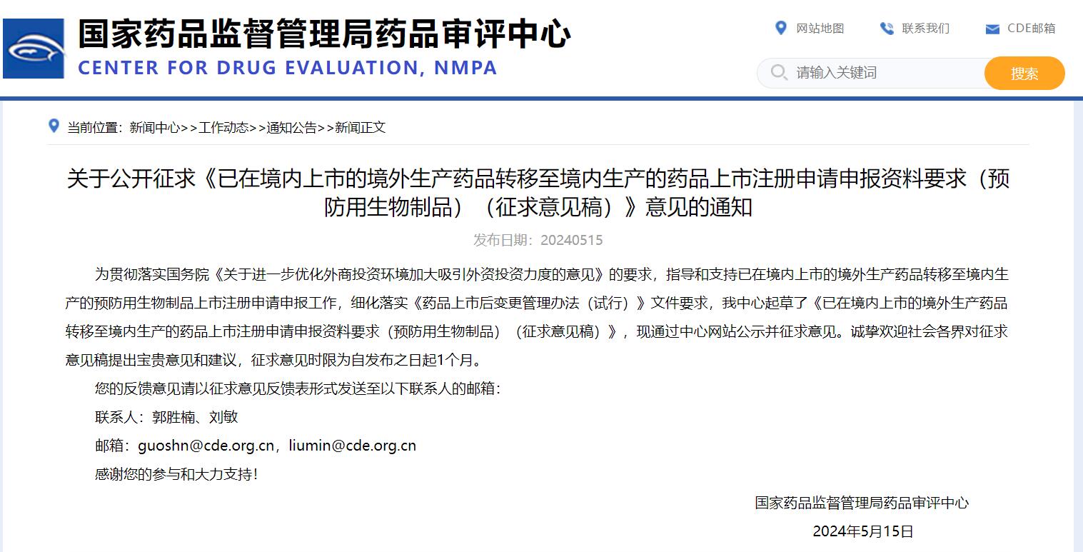 關(guān)于公開征求《已在境內(nèi)上市的境外生產(chǎn)藥品轉(zhuǎn)移至境內(nèi)生產(chǎn)的藥品上市注冊申請申報資料要求(預(yù)防用生物制品)(征求意見稿)》意見的通知