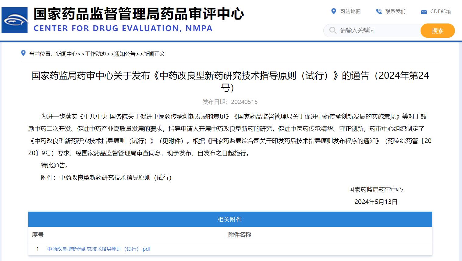 國家藥監(jiān)局藥審中心關(guān)于發(fā)布《中藥改良型新藥研究技術(shù)指導(dǎo)原則(試行)》的通告(2024年第24號)