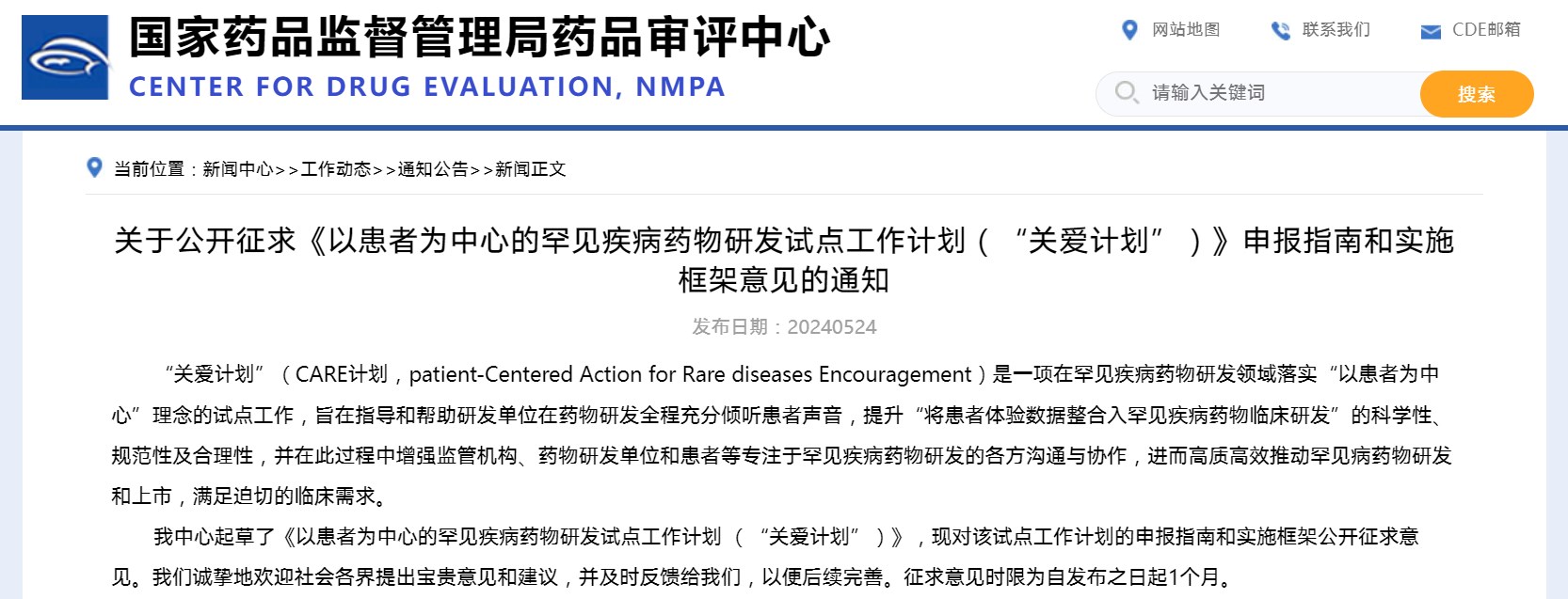 關(guān)于公開(kāi)征求《以患者為中心的罕見(jiàn)疾病藥物研發(fā)試點(diǎn)工作計(jì)劃(“關(guān)愛(ài)計(jì)劃”)》申報(bào)指南和實(shí)施框架意見(jiàn)的通知