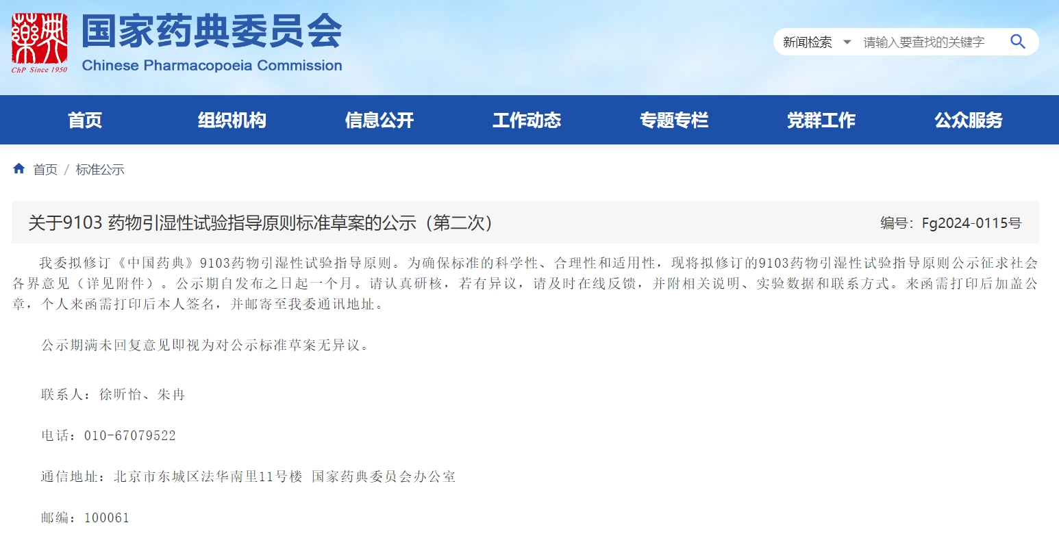 關(guān)于9103藥物引濕性試驗(yàn)指導(dǎo)原則標(biāo)準(zhǔn)草案的公示(第二次)