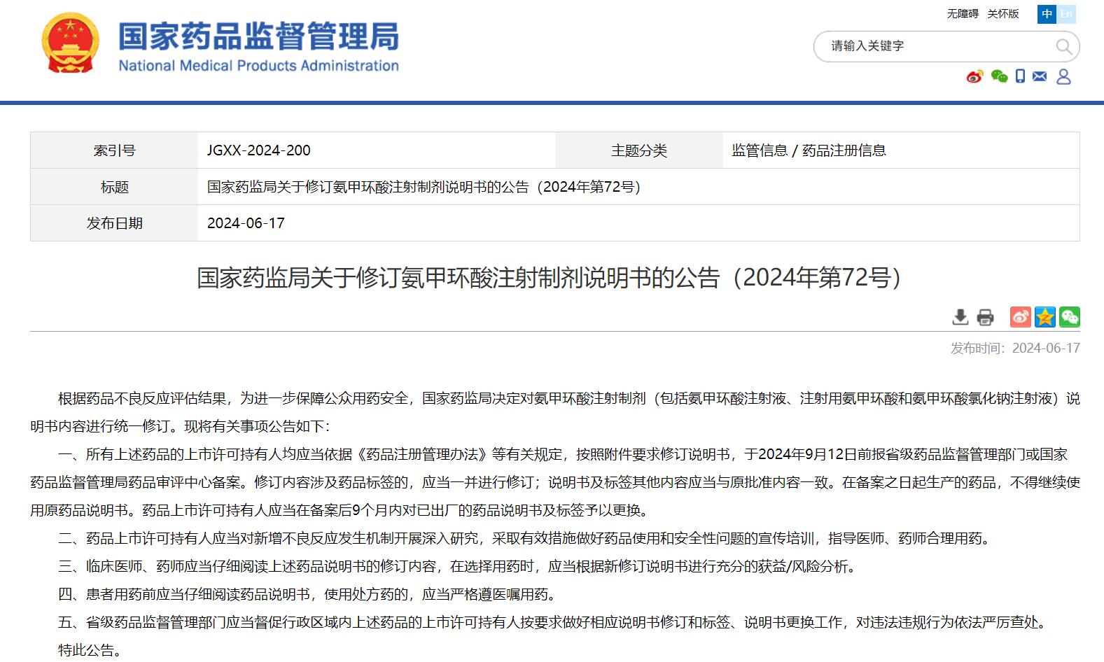 國家藥監(jiān)局關(guān)于修訂氨甲環(huán)酸注射制劑說明書的公告(2024年第72號)
