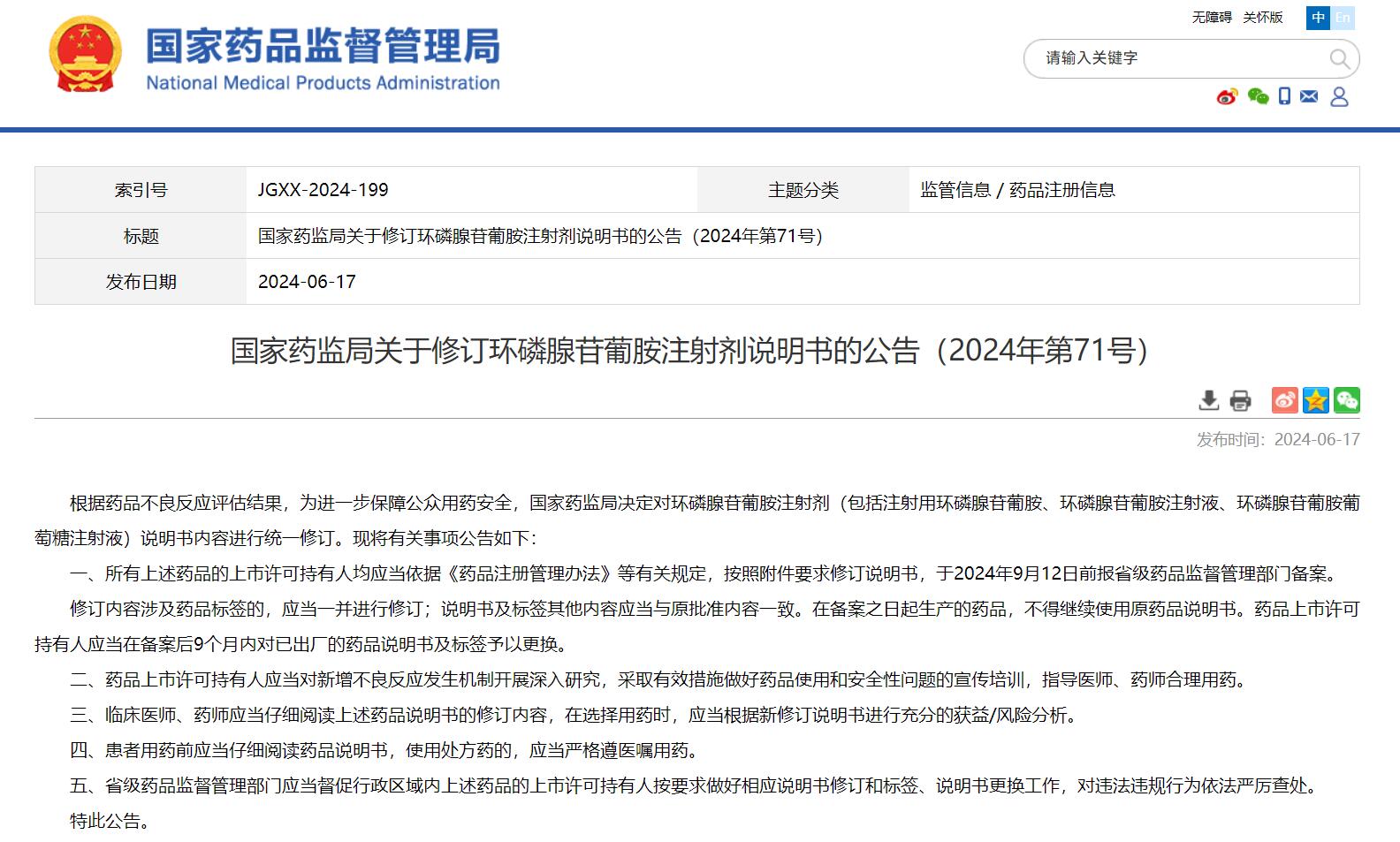 國家藥監(jiān)局關(guān)于修訂環(huán)磷腺苷葡胺注射劑說明書的公告(2024年第71號)