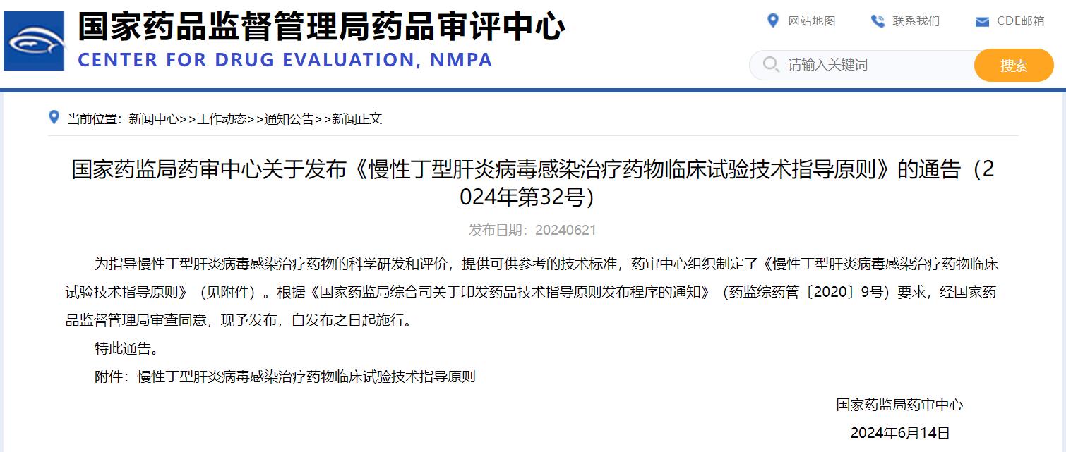 國家藥監(jiān)局藥審中心關(guān)于發(fā)布《慢性丁型肝炎病毒感染治療藥物臨床試驗(yàn)技術(shù)指導(dǎo)原則》的通告(2024年第32號)