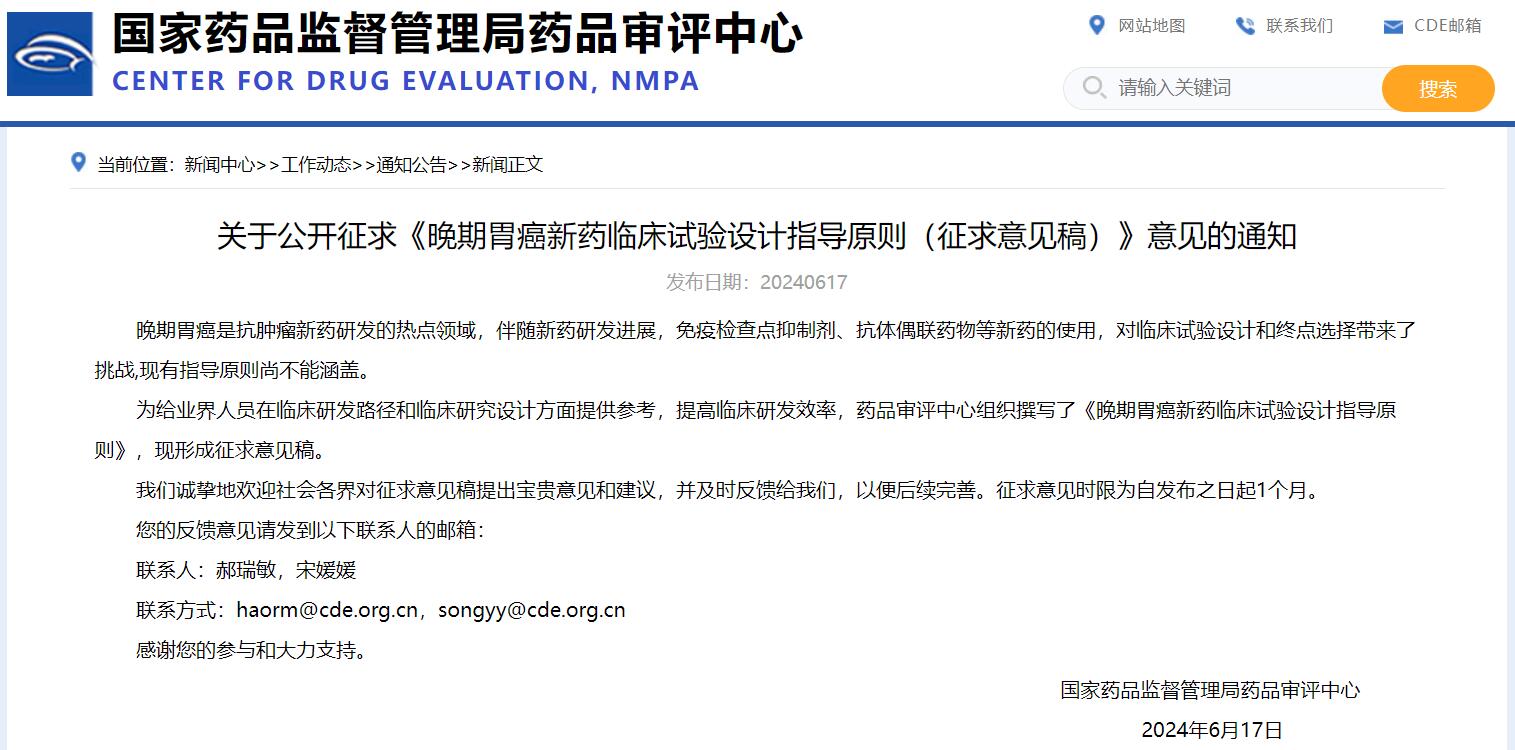 關(guān)于公開征求《晚期胃癌新藥臨床試驗(yàn)設(shè)計指導(dǎo)原則(征求意見稿)》意見的通知