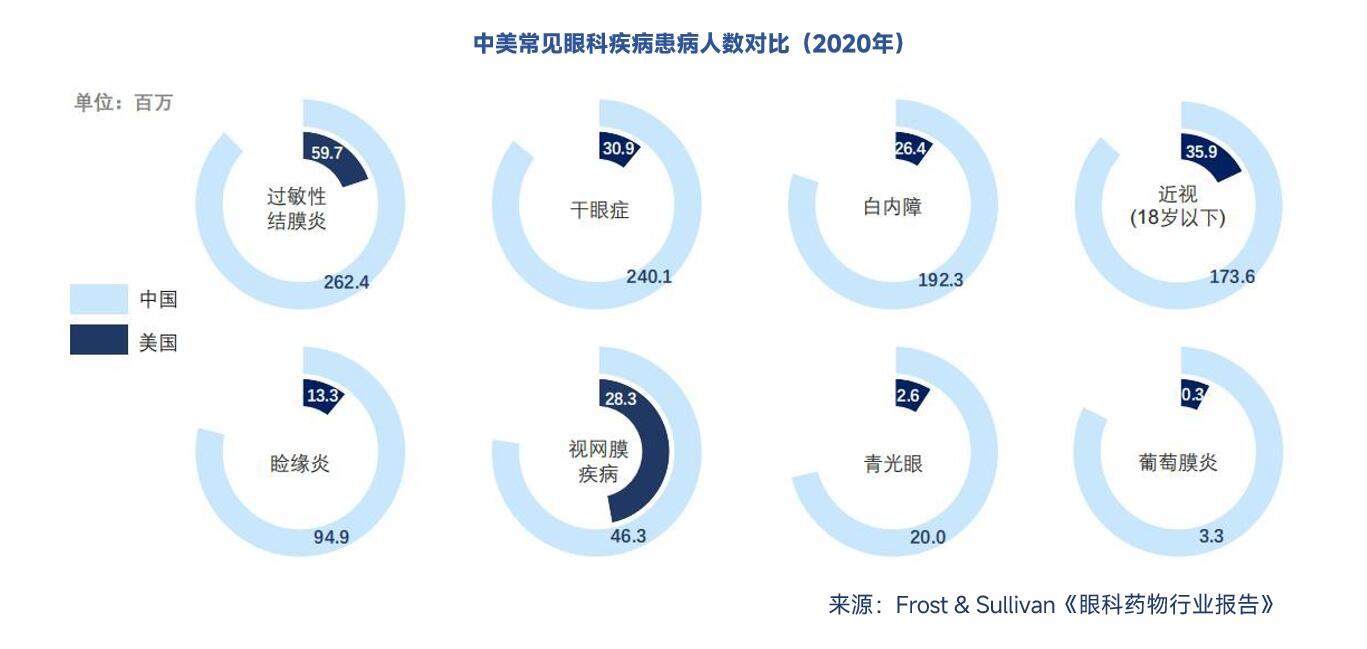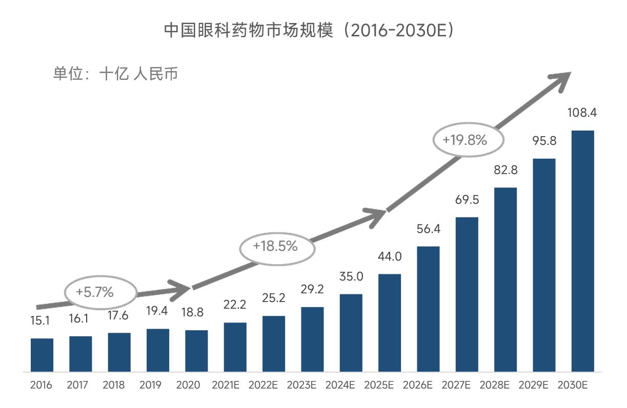 目前,全球眼科市場整體呈現(xiàn)出穩(wěn)定增長、集中度較高的特點。2016年至2020 年,全球眼科藥物市場規(guī)模從277億美元增長至327億美元,復合年增長率為 4.2%。隨著未來更多眼科創(chuàng)新藥物的研發(fā)和上市,預計2025年將達到464億美元,2030年將達到739億美元。2016-2020年中國眼科藥物市場規(guī)模從151億增長至188億元,復合年增長率達5.7%,預計2025年將達到440億元,2030年將達到1084億元。預計未來,中國將以超過全球2倍的平均增長率快速增長,發(fā)展勢頭強勁。