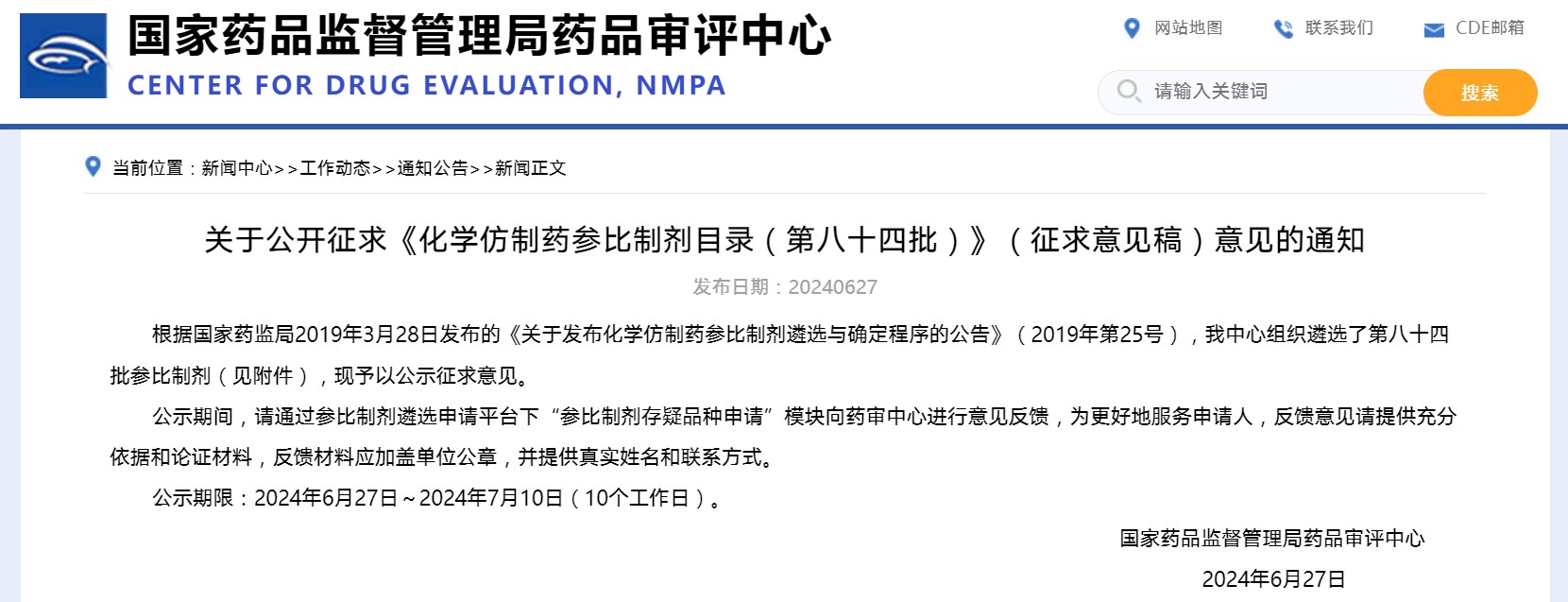 關(guān)于公開征求《化學(xué)仿制藥參比制劑目錄(第八十四批)》(征求意見稿)意見的通知