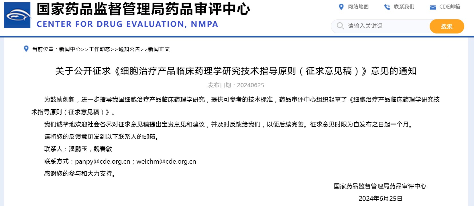 關(guān)于公開征求《細(xì)胞治療產(chǎn)品臨床藥理學(xué)研究技術(shù)指導(dǎo)原則(征求意見稿)》意見的通知