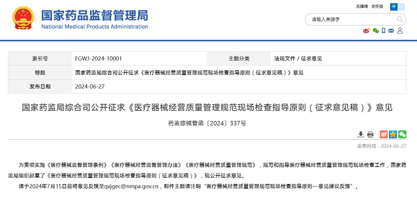 公開征求《醫(yī)療器械經(jīng)營質(zhì)量管理規(guī)范現(xiàn)場檢查指導(dǎo)原則(征求意見稿)》意見