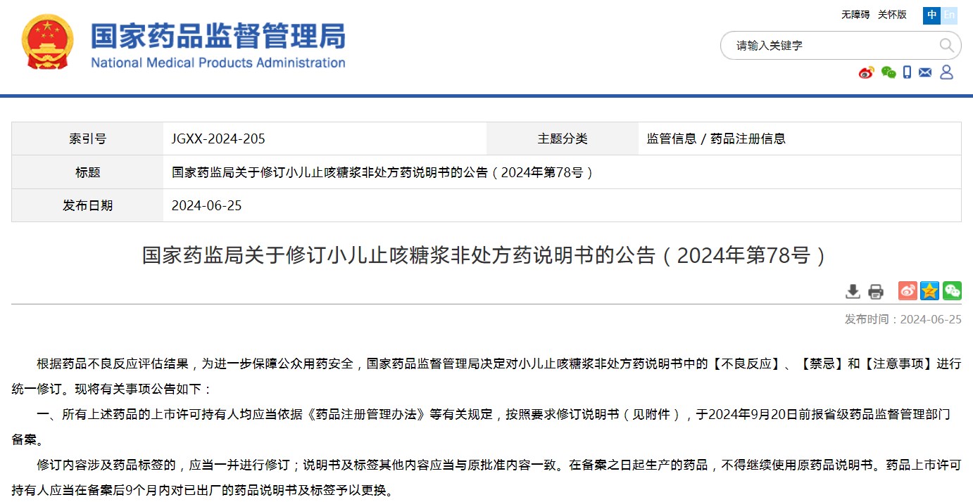 關(guān)于修訂小兒止咳糖漿非處方藥說明書的公告
