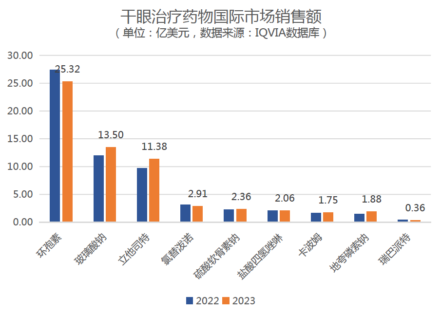 2023年,國(guó)際市場(chǎng)干眼癥的銷售額最高的產(chǎn)品變化不大,主要有環(huán)孢素(25.32億)、玻璃酸鈉(13.50億)、立他司特(11.38億)和氯替潑諾(2.91億)。從增長(zhǎng)情況來(lái)看,增長(zhǎng)率最快的產(chǎn)品分別為立他司特(+16.7%)、玻璃酸鈉(13.0%)和地夸磷索鈉(+29.7%)。