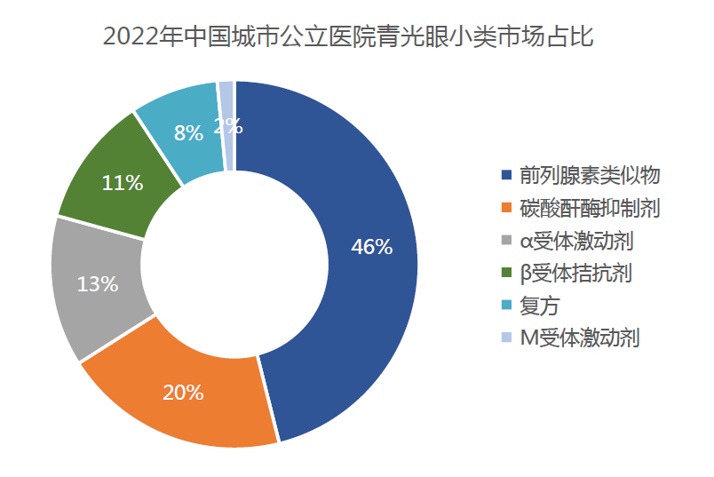 抗青光眼藥物可分為5類,作為一線治療藥物的前列腺素類似物在2022年以46%的比例主導(dǎo)市場(chǎng),碳酸酐酶抑制劑、β腎上腺素拮抗劑、α腎上腺素能受體激動(dòng)劑、復(fù)方制劑分別占20%、13%、11%和8%的市場(chǎng)份額。