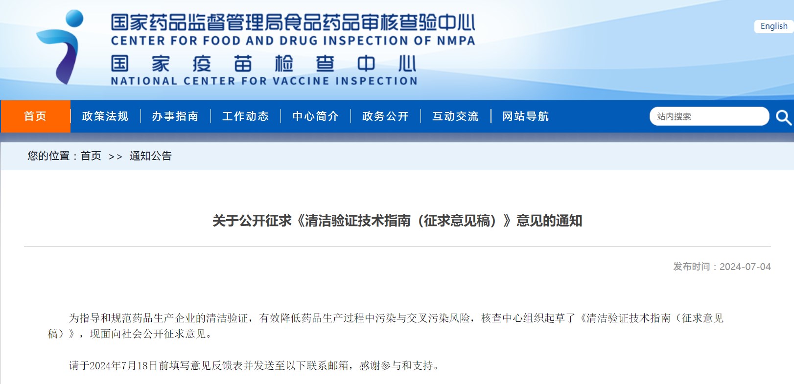 關(guān)于公開征求《清潔驗(yàn)證技術(shù)指南(征求意見稿)》意見的通知