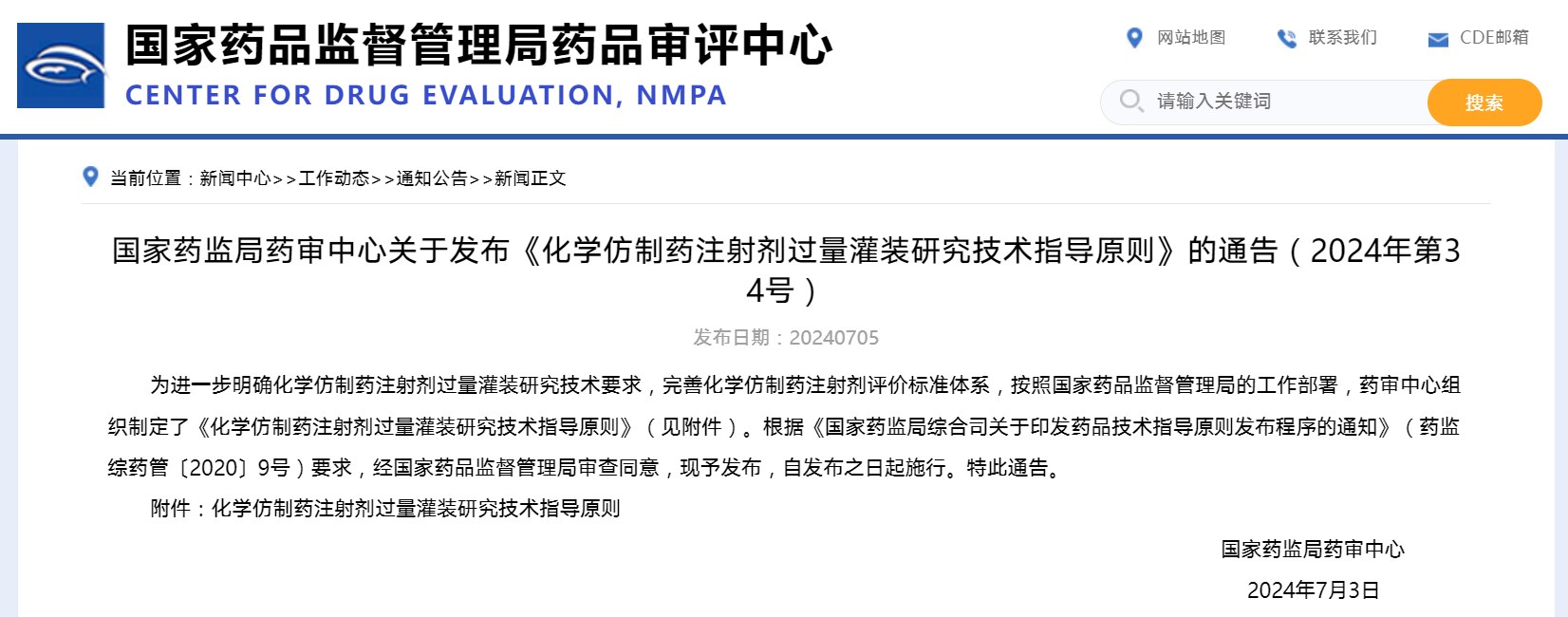 國家藥監(jiān)局藥審中心關(guān)于發(fā)布《化學(xué)仿制藥注射劑過量灌裝研究技術(shù)指導(dǎo)原則》的通告(2024年第34號(hào))