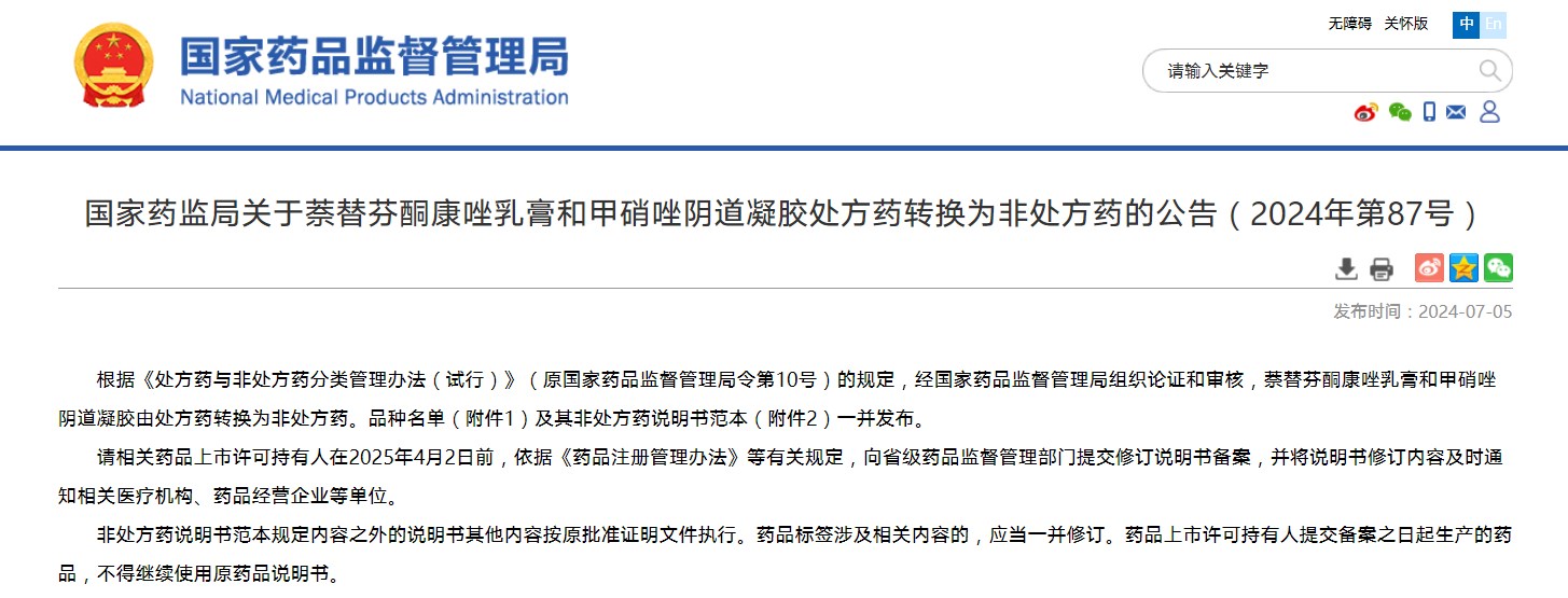 國家藥監(jiān)局關(guān)于萘替芬酮康唑乳膏和甲硝唑陰道凝膠處方藥轉(zhuǎn)換為非處方藥的公告(2024年第87號(hào))