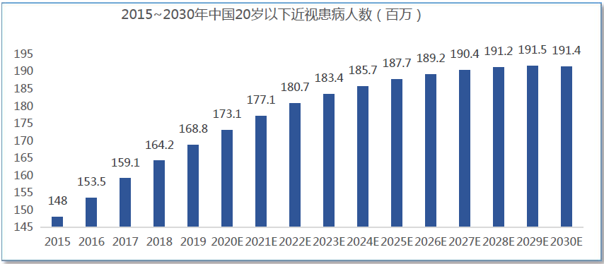 圖8:2015-2030年中國(guó)20歲以下近視患病人數(shù)