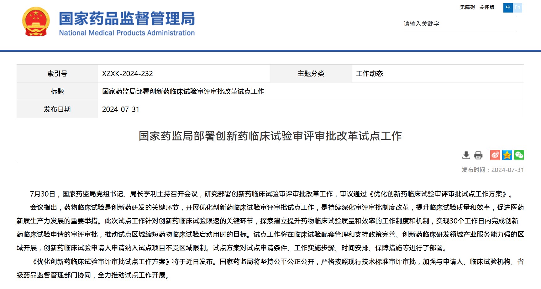 國家藥監(jiān)局部署創(chuàng)新藥臨床試驗(yàn)審評審批改革試點(diǎn)工作(附法規(guī)概覽07.29-08.02)