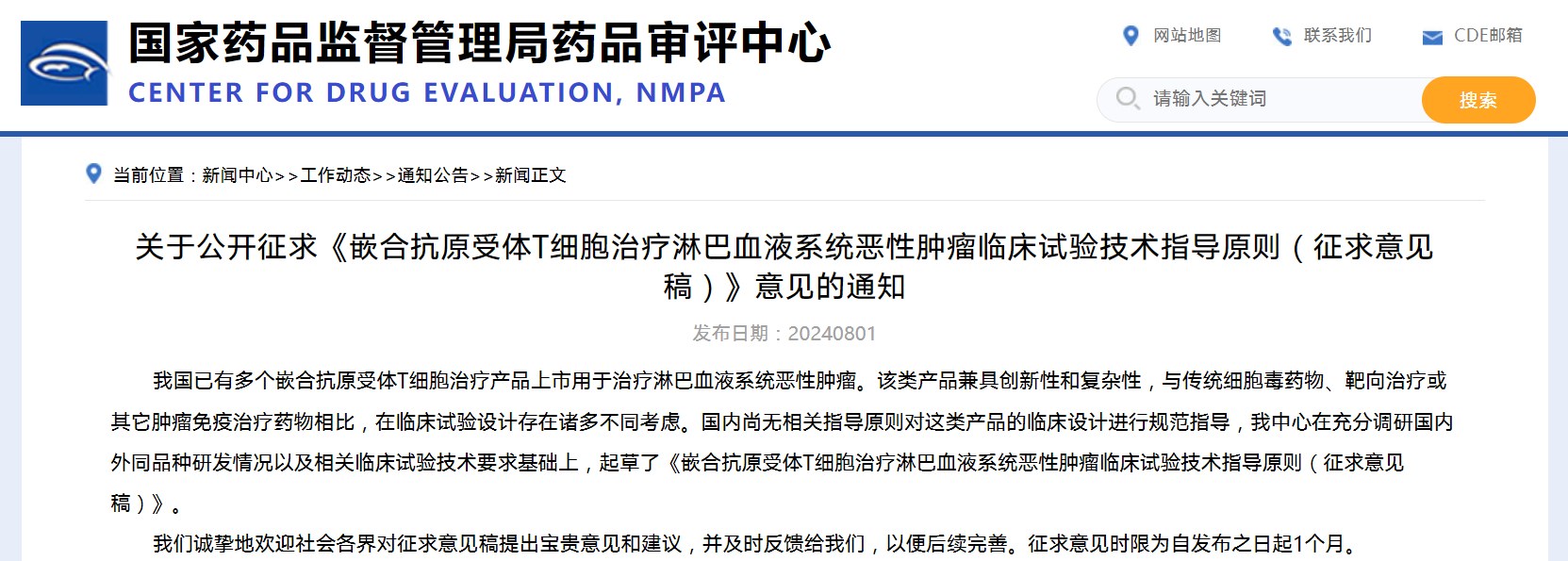 關(guān)于公開征求《嵌合抗原受體T細(xì)胞治療淋巴血液系統(tǒng)惡性腫瘤臨床試驗(yàn)技術(shù)指導(dǎo)原則(征求意見稿)》意見的通知