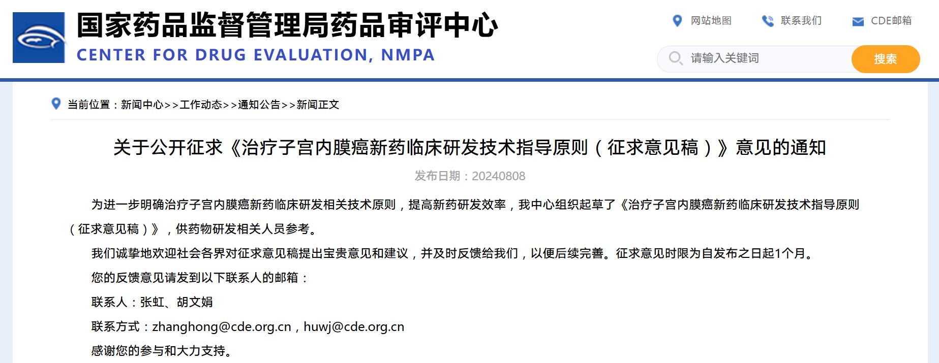 關(guān)于公開征求《治療子宮內(nèi)膜癌新藥臨床研發(fā)技術(shù)指導原則(征求意見稿)》意見的通知