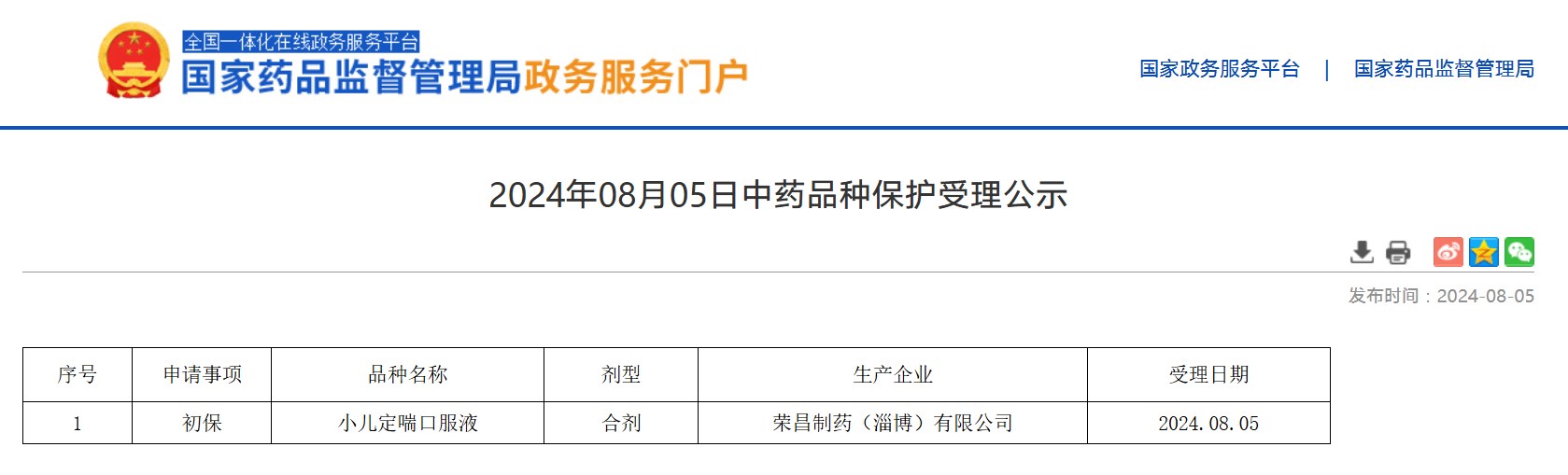2024年08月05日中藥品種保護受理公示