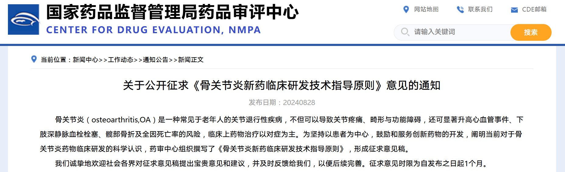 國(guó)家藥監(jiān)局藥審中心關(guān)于公開(kāi)征求《骨關(guān)節(jié)炎新藥臨床研發(fā)技術(shù)指導(dǎo)原則》意見(jiàn)的通知