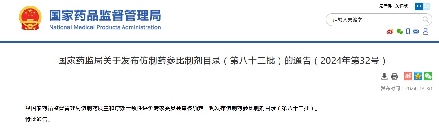 國(guó)家藥監(jiān)局關(guān)于發(fā)布仿制藥參比制劑目錄(第八十二批)的通告(2024年第32號(hào))