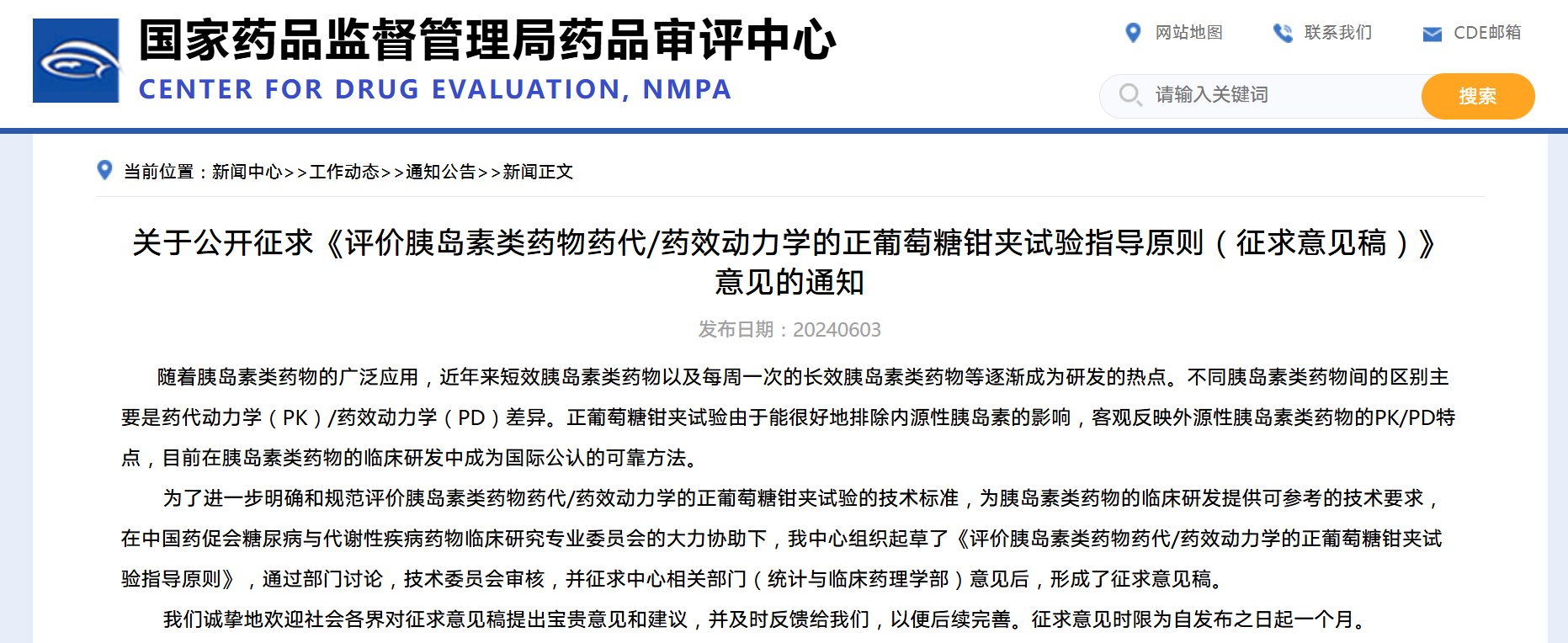 關(guān)于公開(kāi)征求《評(píng)價(jià)胰島素類藥物藥代/藥效動(dòng)力學(xué)的正葡萄糖鉗夾試驗(yàn)指導(dǎo)原則(征求意見(jiàn)稿)》意見(jiàn)的通知