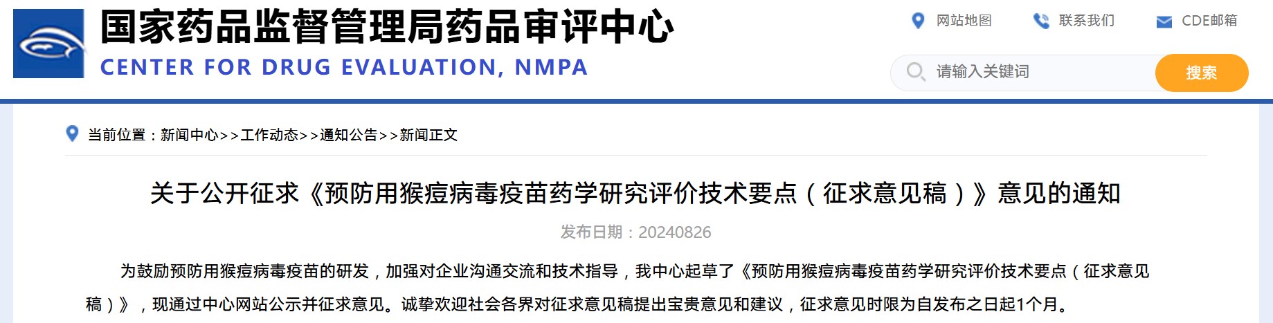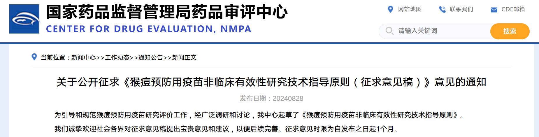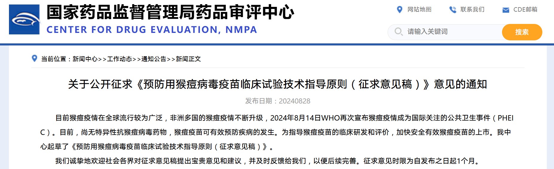 關(guān)于公開(kāi)征求《預(yù)防用猴痘病毒疫苗藥學(xué)研究評(píng)價(jià)技術(shù)要點(diǎn)(征求意見(jiàn)稿)》意見(jiàn)的通知