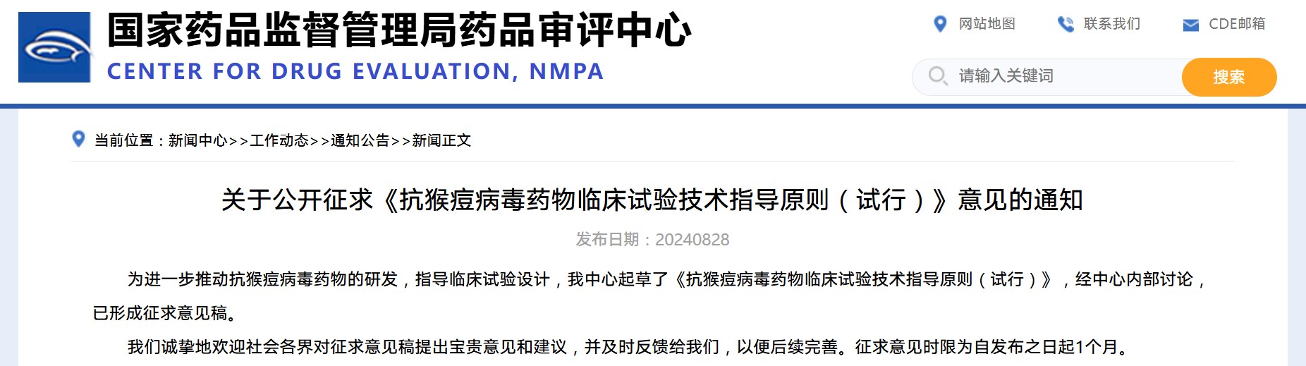 關(guān)于公開(kāi)征求《抗猴痘病毒藥物臨床試驗(yàn)技術(shù)指導(dǎo)原則(試行)》意見(jiàn)的通知