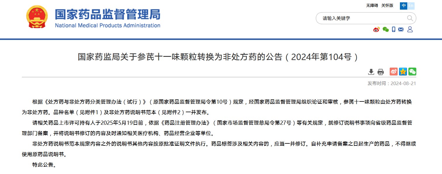 國(guó)家藥監(jiān)局關(guān)于參芪十一味顆粒轉(zhuǎn)換為非處方藥的公告(2024年第104號(hào))