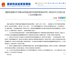 2020年5月14日,國家局一改往日習慣,在非假期前的工作日發(fā)布了重磅通告“國家藥監(jiān)局關于開展化學藥品注射劑仿制藥質(zhì)量和療效一致性評價工作的公告(2020年第62號)”(以下簡稱“通告”),與此同時,CDE同步發(fā)布《化學藥品注射劑仿制藥質(zhì)量和療效一致性評價技術(shù)要求》 -